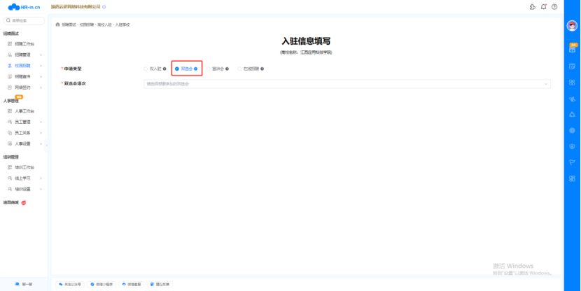 第二步:若之前未入駐該高校,則需提交入駐申請(qǐng)。在該場(chǎng)景下選擇【雙選會(huì)】申請(qǐng)類型,同時(shí)填寫入駐信息和雙選會(huì)申請(qǐng)信息。信息填寫完成后點(diǎn)擊【提交】完成雙選會(huì)報(bào)名。